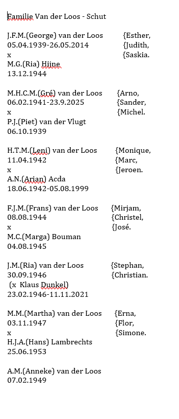 Bij de Schutten-reünie in 2023 kwamen bij Monique, dochter van Leni, en Sander, zoon van Gre, het idee op om een reünie te organiseren voor de tantes en ooms, neven en nichten van de familie van der Loos. Zie hieronder de foto’s die gemaakt zijn op 9 juni jl. bij de brunch in ‘De Oude Keuken’ in Castricum. Het was heel gezellig om iedereen weer eens terug te zien en te spreken. Zeker voor herhaling vatbaar.